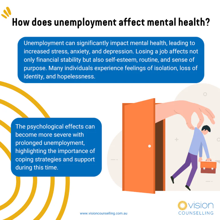 Losing a job can affect self-esteem, leading to feelings of sadness or even depression. The Australian Institute of Health and Welfare (AIHW) reports that the psychosocial stress associated with unemployment has a profound impact on both physical and mental health (AIHW). - Loss of Self-Identity and Purpose